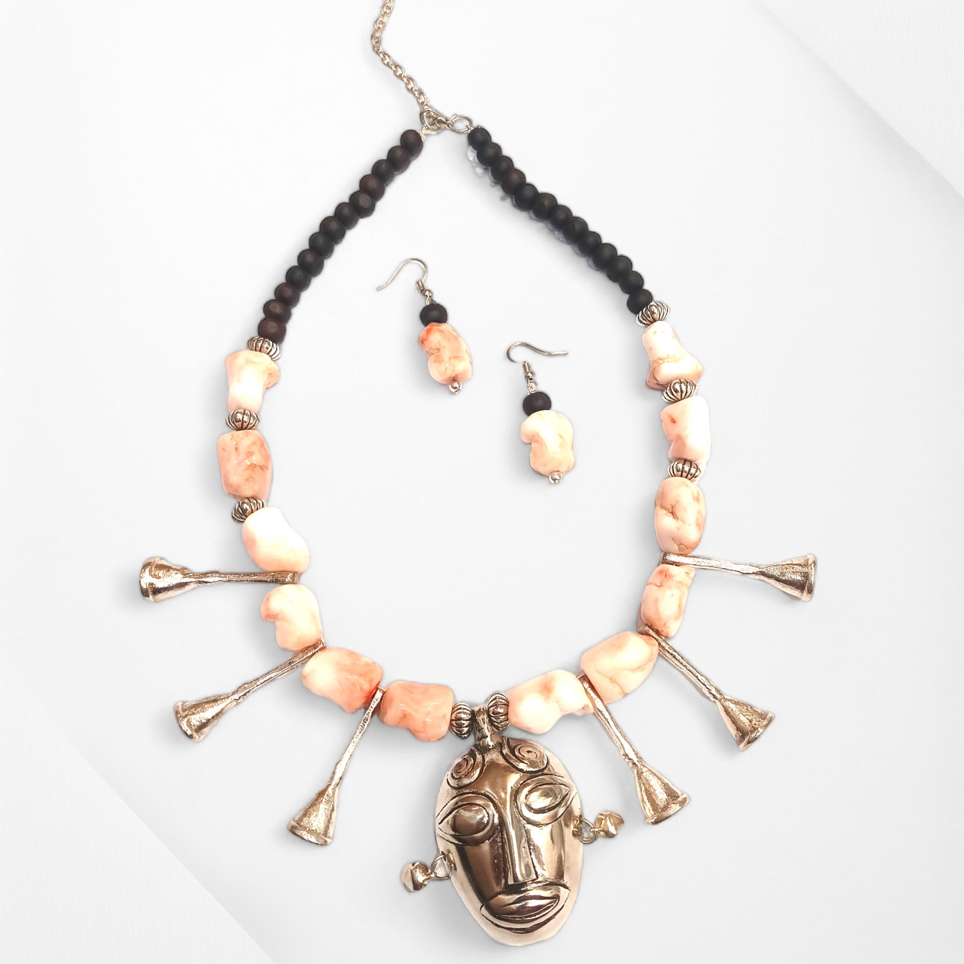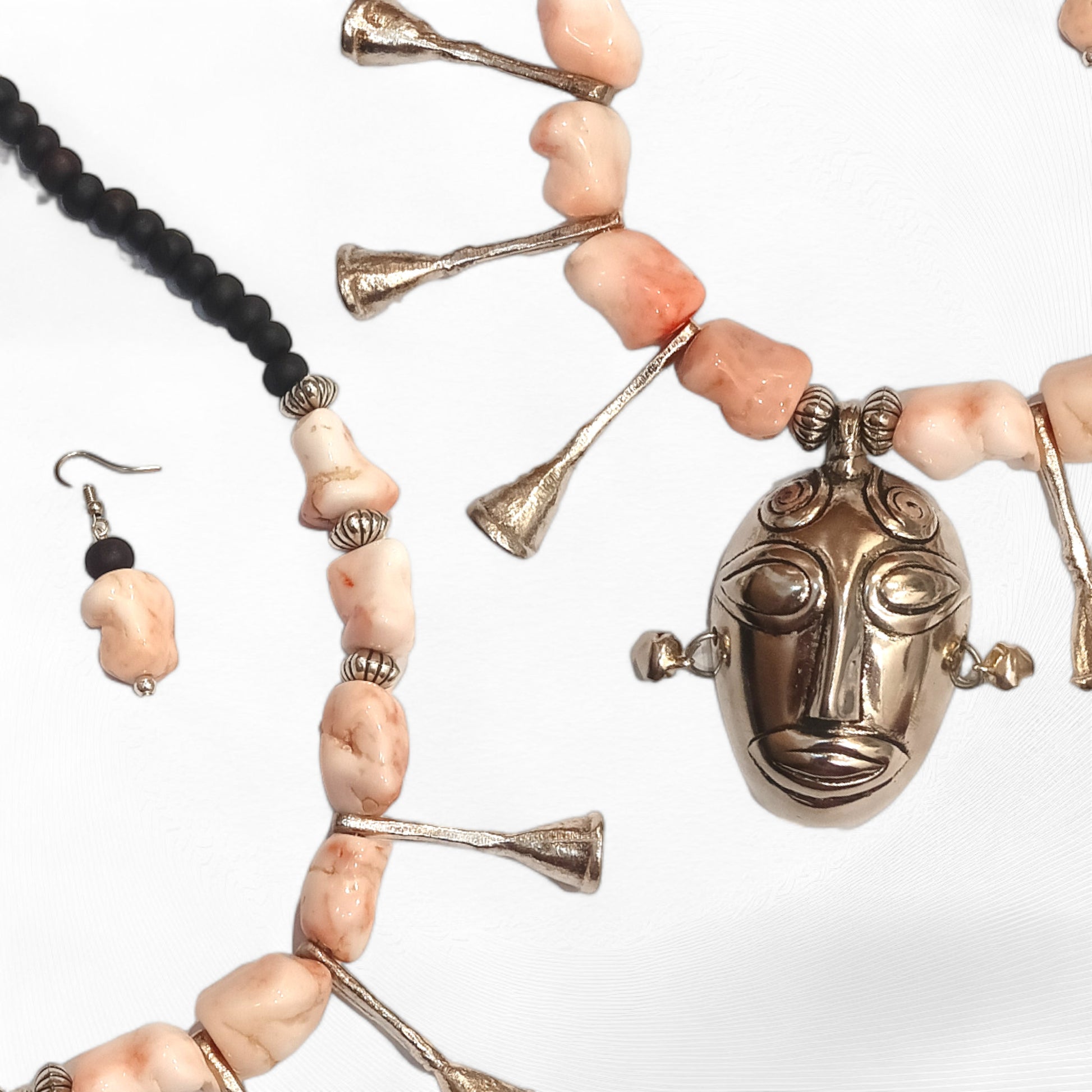 Be the fashion soul in Meauiful’s Big Bead Necklace with Tribal Face Pendant. This huge beaded necklace with earrings is a masterpiece of timeless elegance and tribal heritage. It is beautifully handmade by artisans to give a completely extraordinary look. It has a unique tribal face pendant, metal elements and rosy-colored beads. The mix and match of the elements used to make this necklace set more than an accessory. Talking about the in-detail big bead necklace you will notice irregularly shaped rosy pink stones and beads in black matte color for creating a visually captivating contrast. The tribal face pendant in tribal beads necklace shows elaborated detailing and expressive features, uplifting the essence of tribe vibes. The metallic finish gives the necklace set with earrings a touch of sophistication. The earrings in a glass bead necklace are lightweight and designed to complement the overall look. Shop now this eye-catching huge beaded necklace for a bold look.