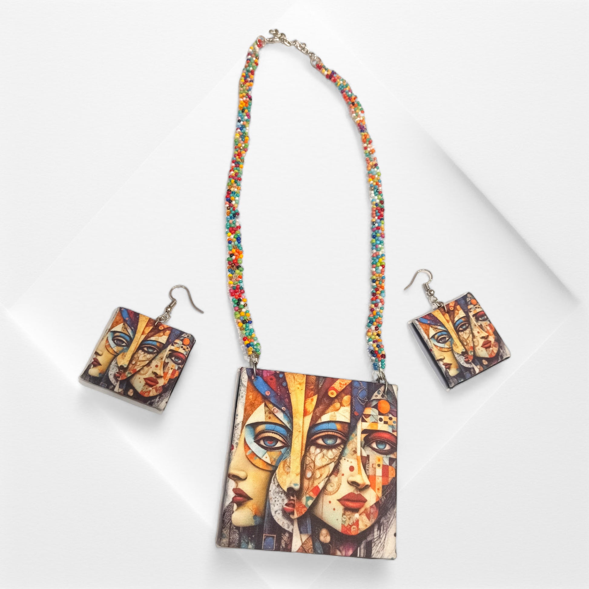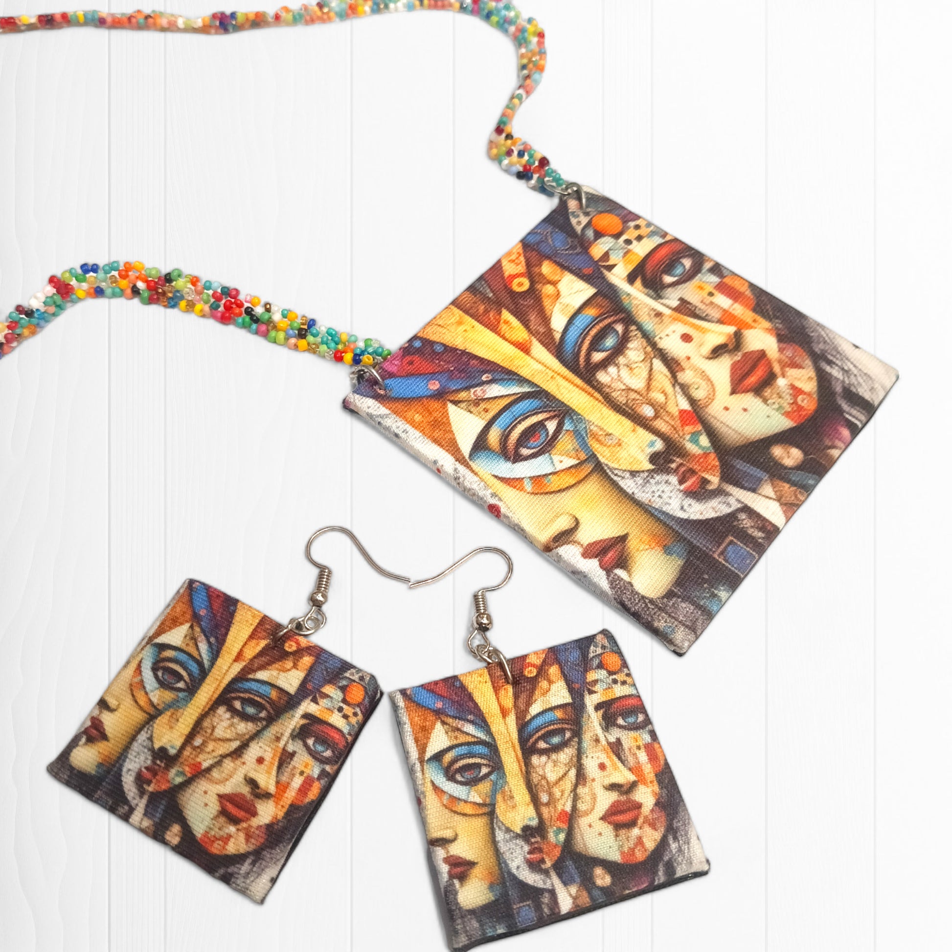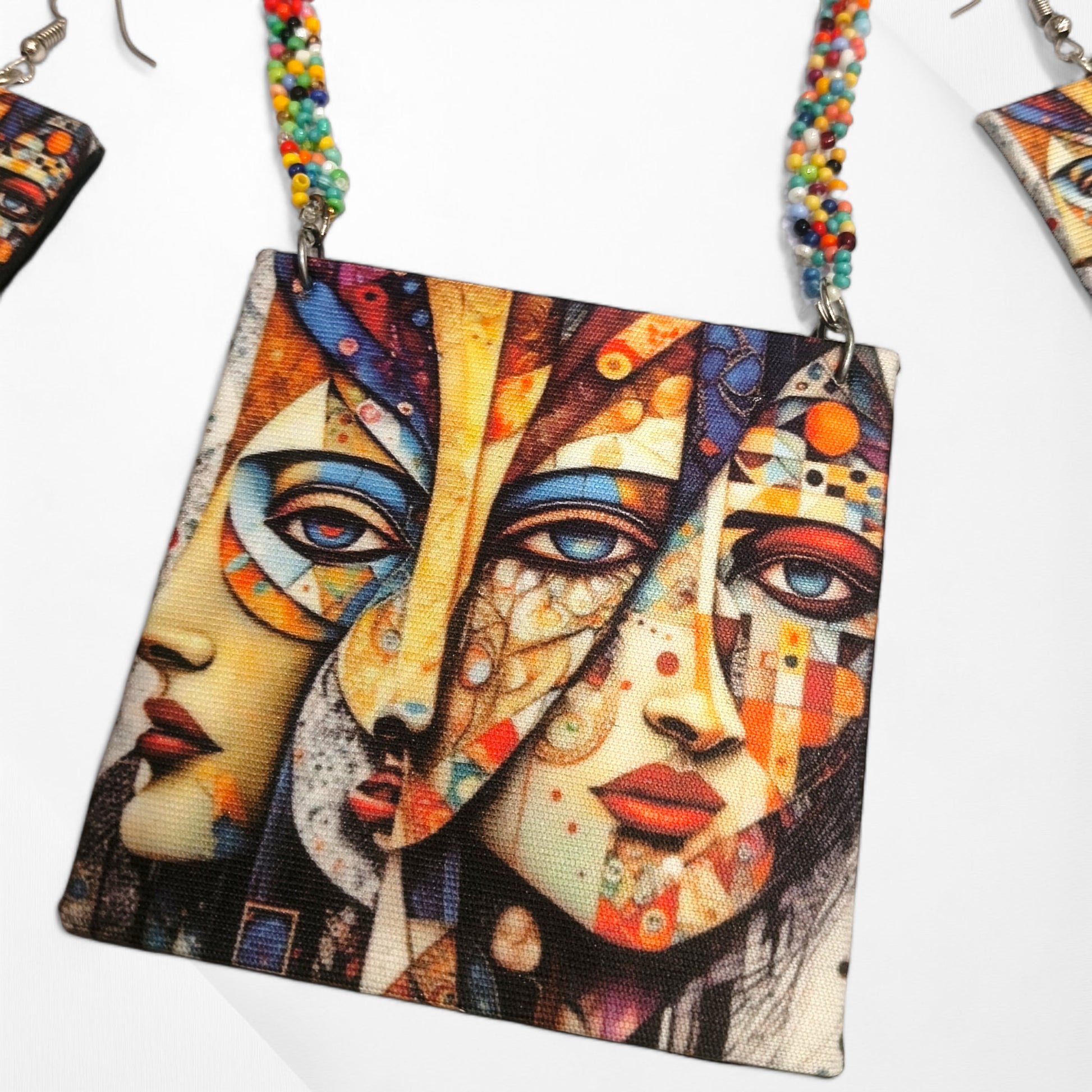 Adorn your neckline with Meauiful’s Colorful Fabric and Bead Necklace Set. Our beaded cloth necklace is handcrafted with an exquisite modern art style fabric pendant and colorful seed beads chain. The fabric cord necklace has contemporary aesthetics, setting your unique style with a unique, creative look. This fabric handmade jewelry is a masterpiece to enhance the overall look. It comes with vibrant and playful hanging earrings. Our Indian artisans have carefully selected the bead's color for an eye-catching and eclectic look. The attractive piece in this overall fabric cord necklace set with earrings is a rectangular shape pendant showcasing the visage of a girl. The complete pendant design narrates, celebrates and expresses individuality in bold, colourful strokes. If you are an art lover and want something alluring, this necklace set has a perfect artistic flair. Pair this fabric handmade jewelry piece with any outfit and complement your overall look.