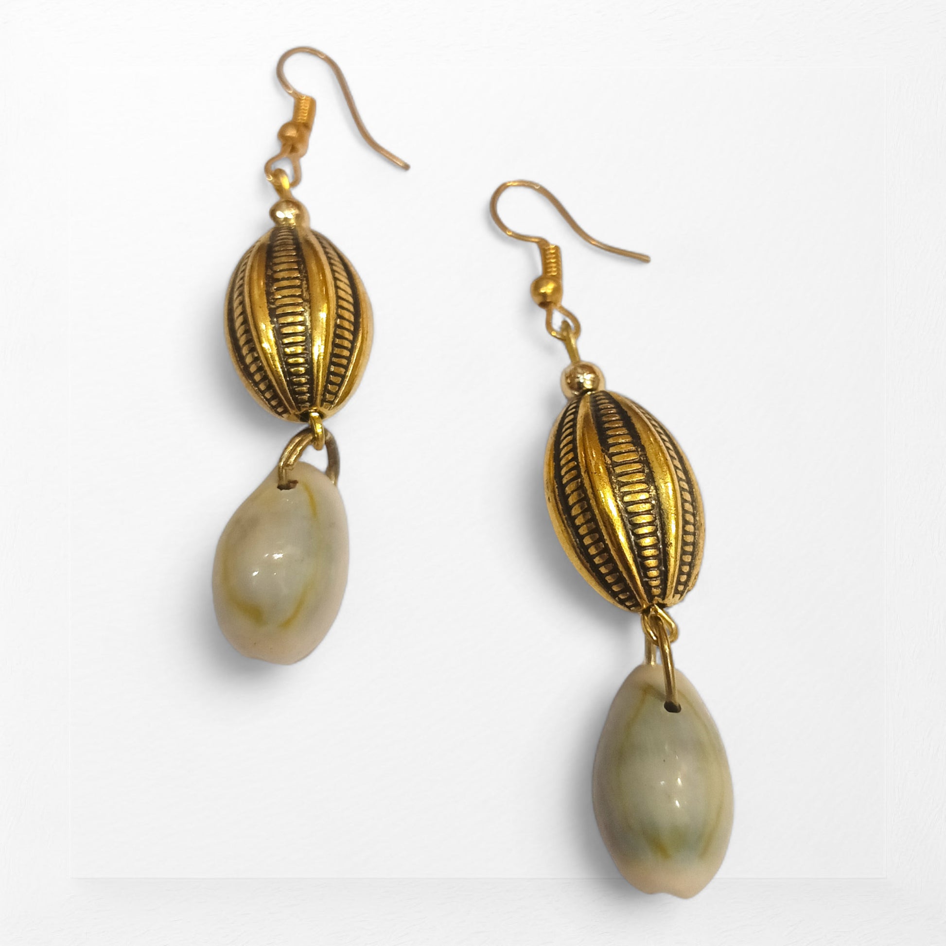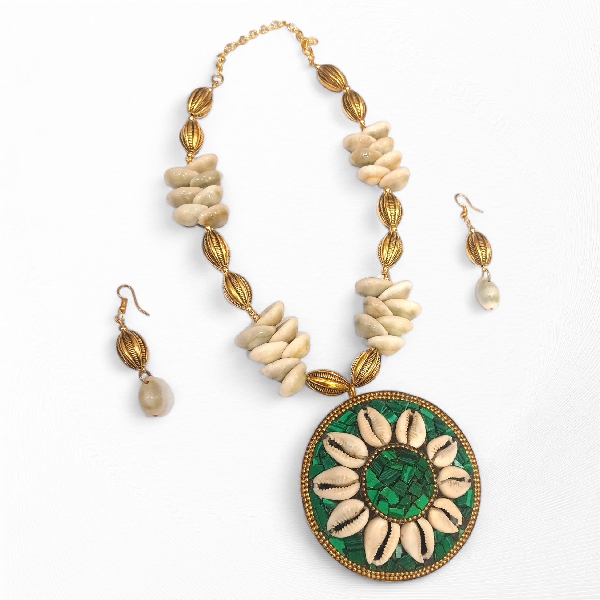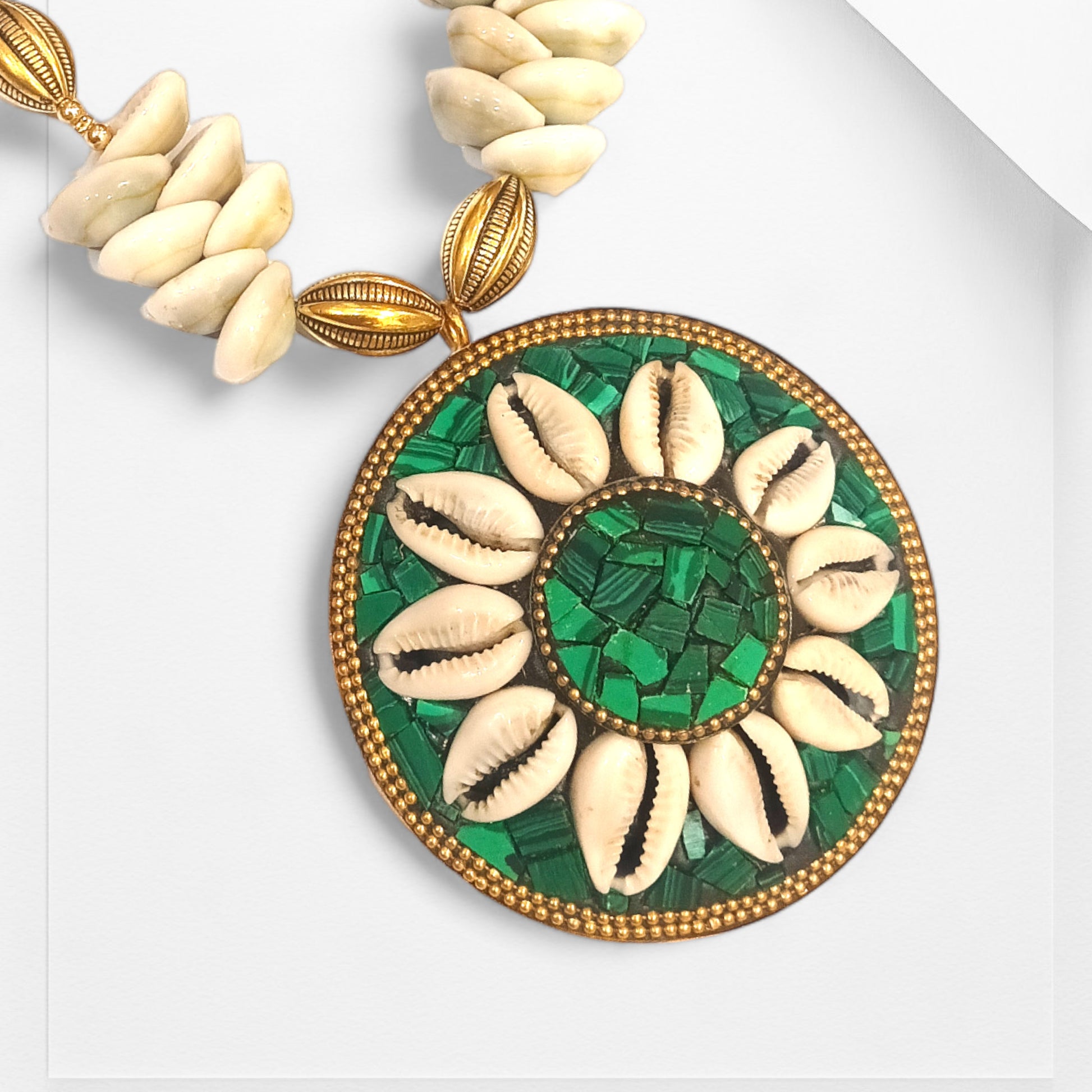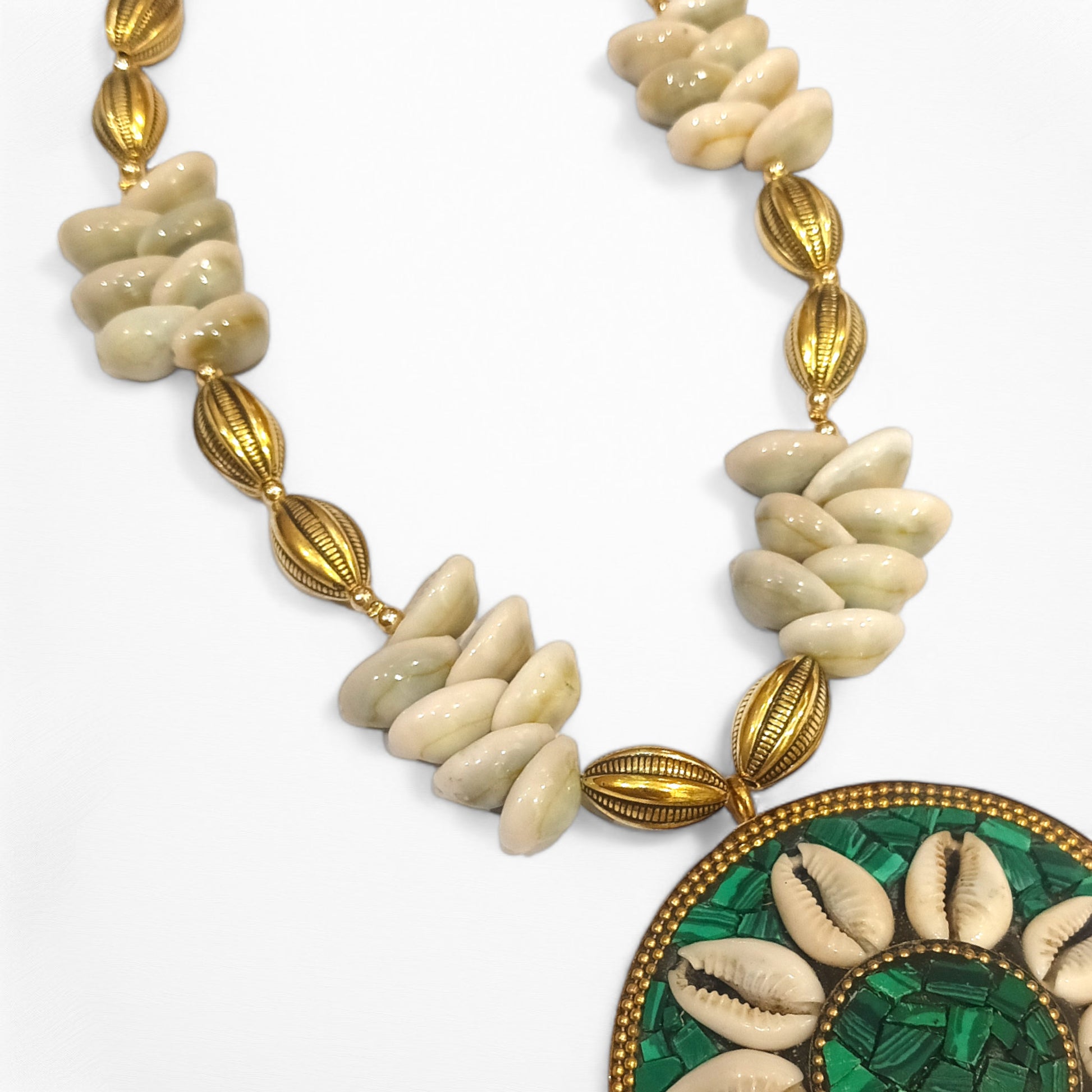 Pick our cultural heritage green and white cowrie shell boho gold necklace. The boho necklace pendant is intricate with handmade artistry. The necklace has a beautiful centrepiece depicting creativity and craftsmanship. The long necklace boho has polished cowrie shells, revealing its natural lustre. There are golden beads that add a touch of refinement and luxury. The boho pendant has a striking look with intricate details and bold size. The boho necklace pendant has green crushed stones arranged in a mosaic-like pattern, excluding artistic flair. Cowrie shells surround the crushed stones on a boho pendant in a circular arrangement. The boho gold necklace is a mix and match of golden beads, cowrie shells and handcrafted stones, creating perfect colors and textures. You can pair this long necklace boho with a beachside soiree, maxi dress, or casual outfit for an earthy elegance.