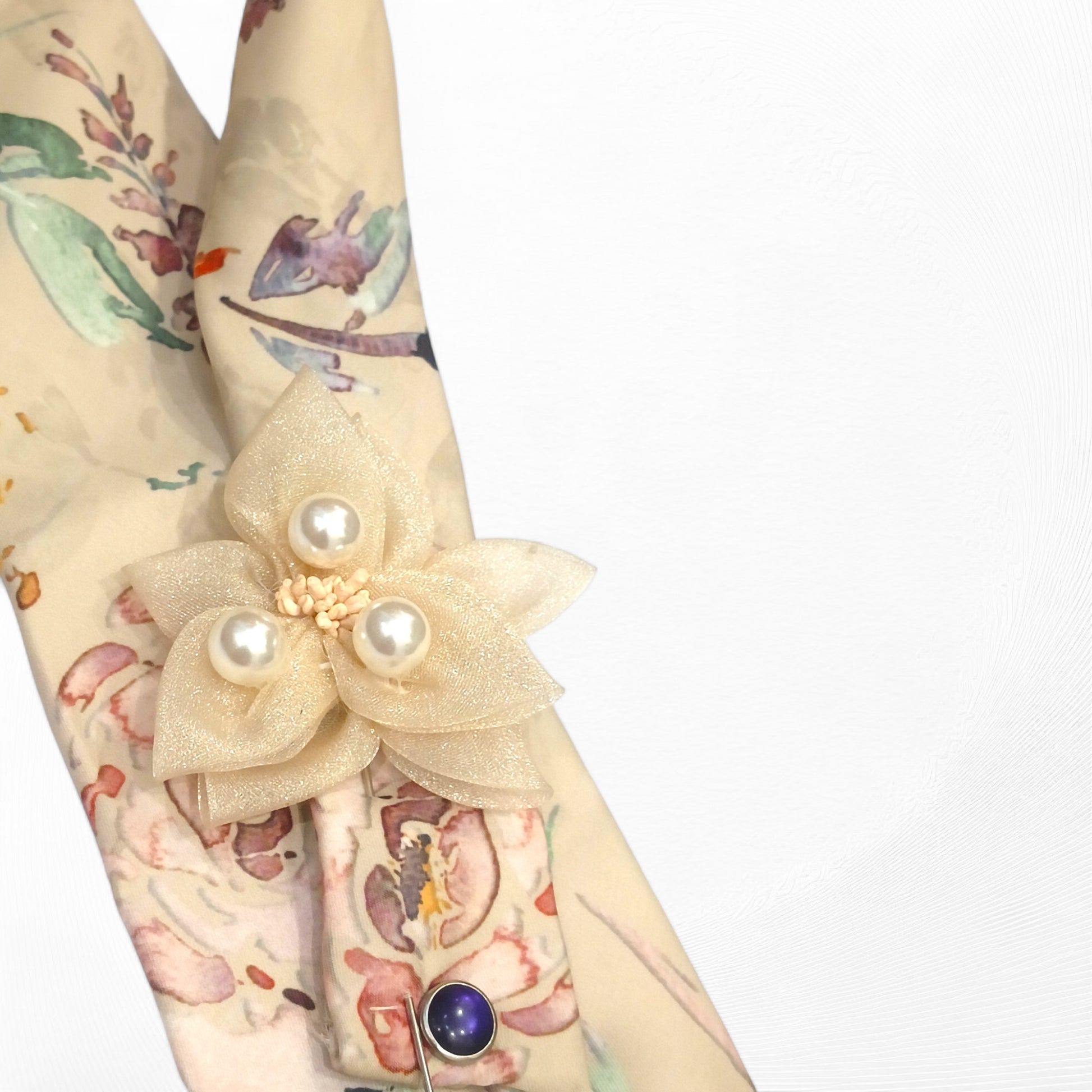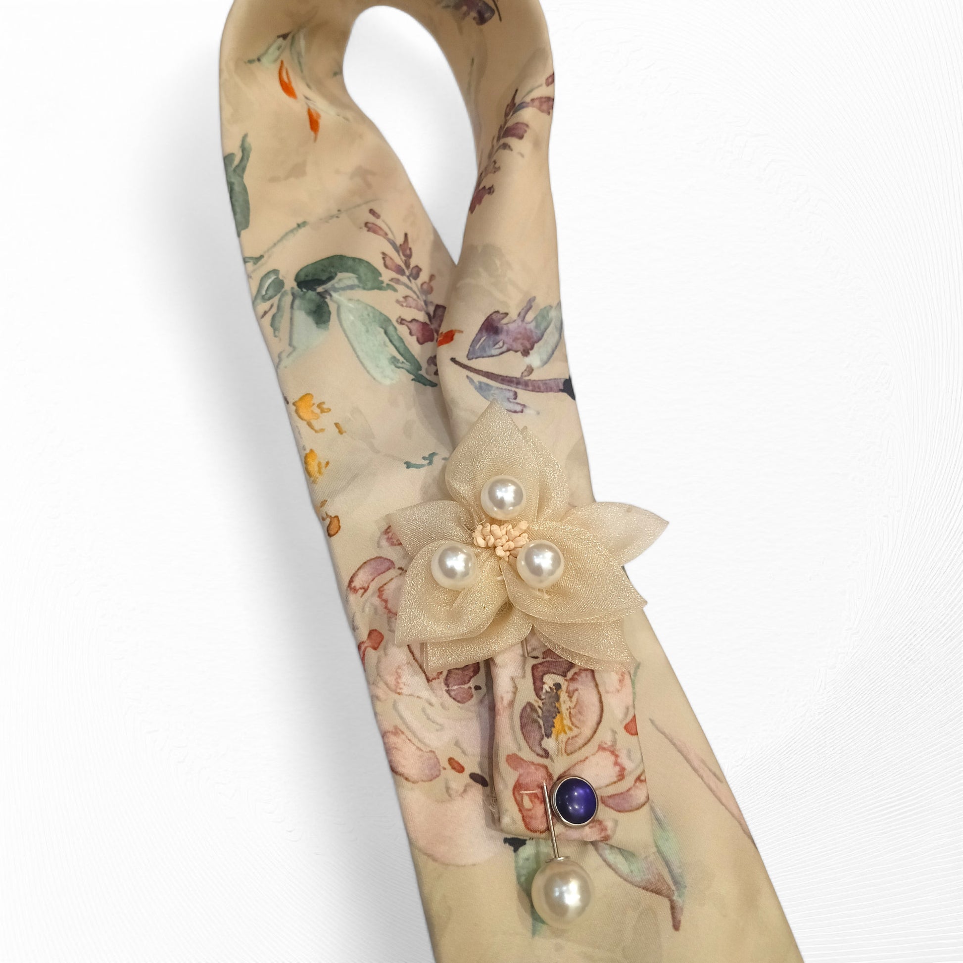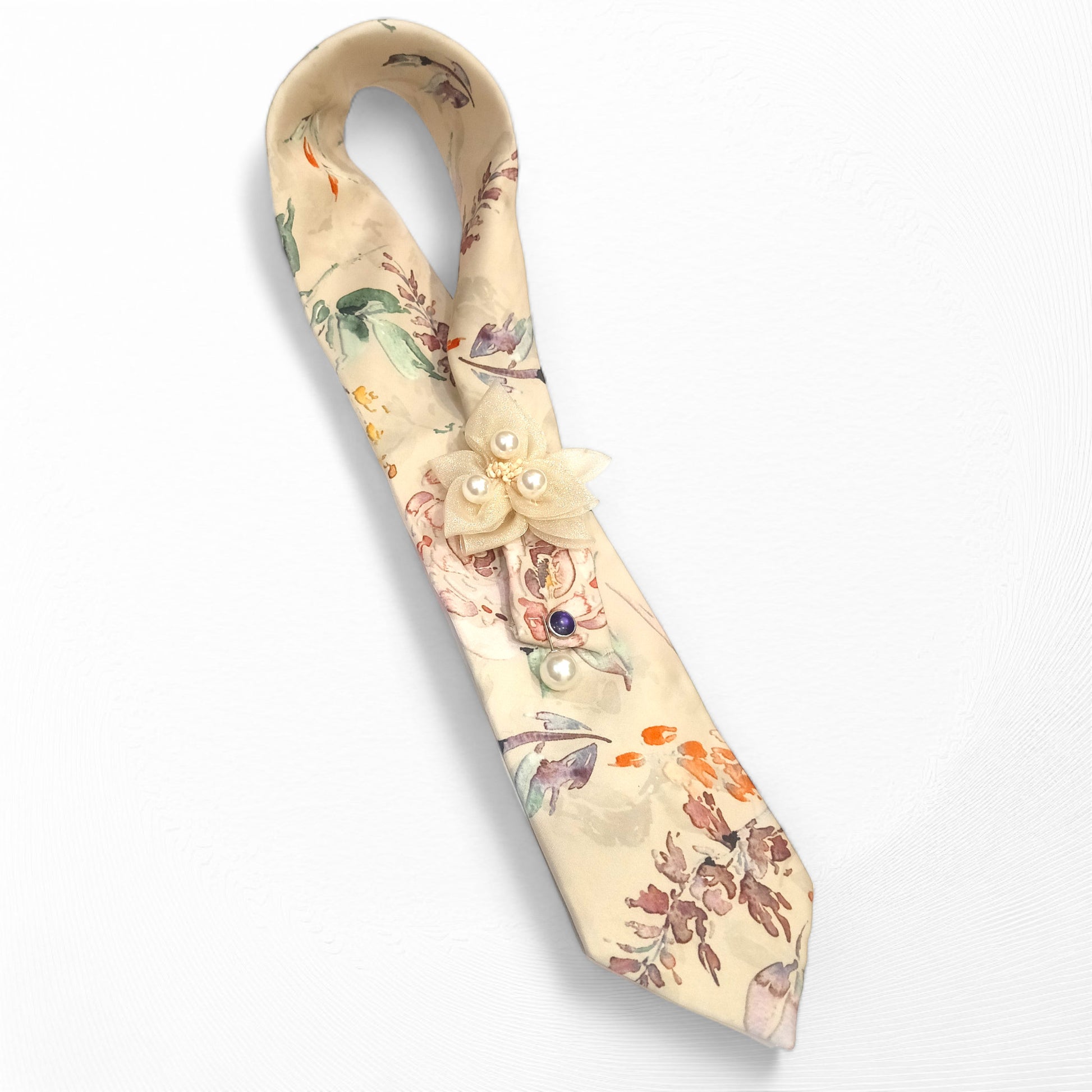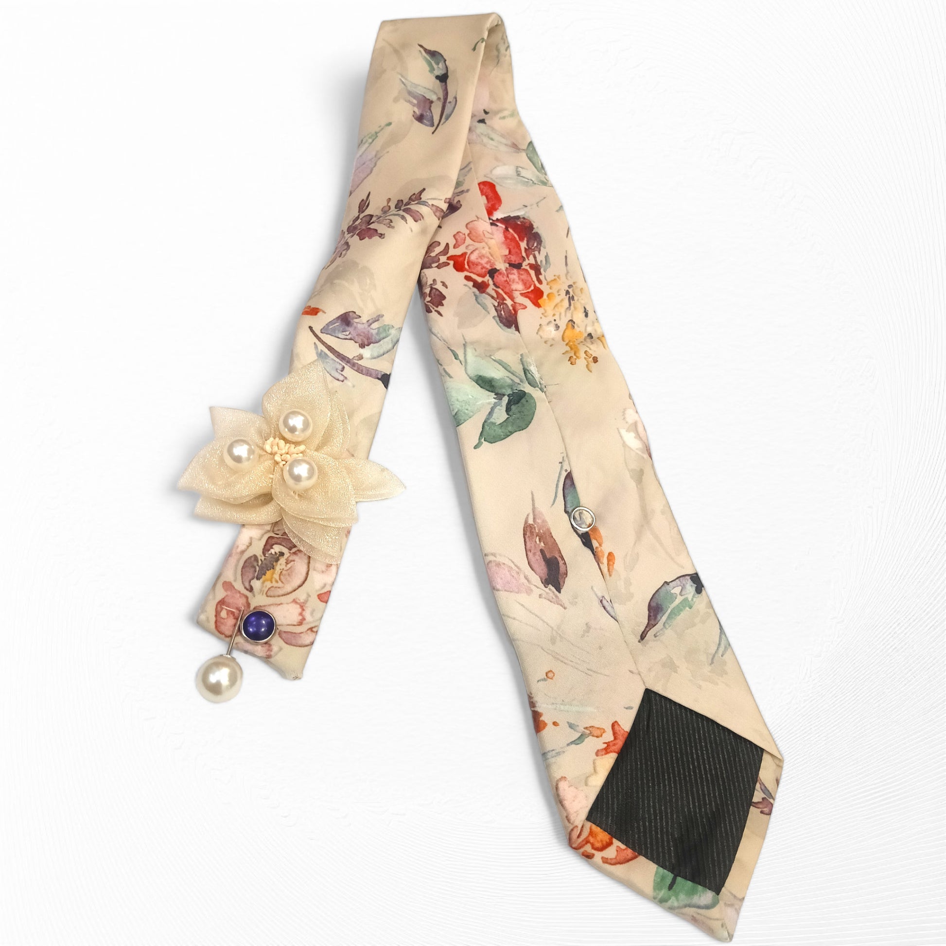 Wear the innovative masterpiece by Meauiful. Our necktie necklace is an elegant accessory that will make you look stunning. This fabric necklace is a versatile piece of our jewelry collection designed by Indian artisans for your office look. It is also good for your skin. Pairing this cream-colored necktie necklace with a Royal Blue, Black, or any dark-colored shirt will add a touch of luxury to your outfit. The necktie necklace has a beautifully flowered pattern with a cream-colored adorned flower. The pearl-like stone adds a touch of timeless elegance. This necktie necklace supports ethical practices contributing to saving Mother Earth. Overall, this fabric necklace is a perfect jewel piece for office meetings.