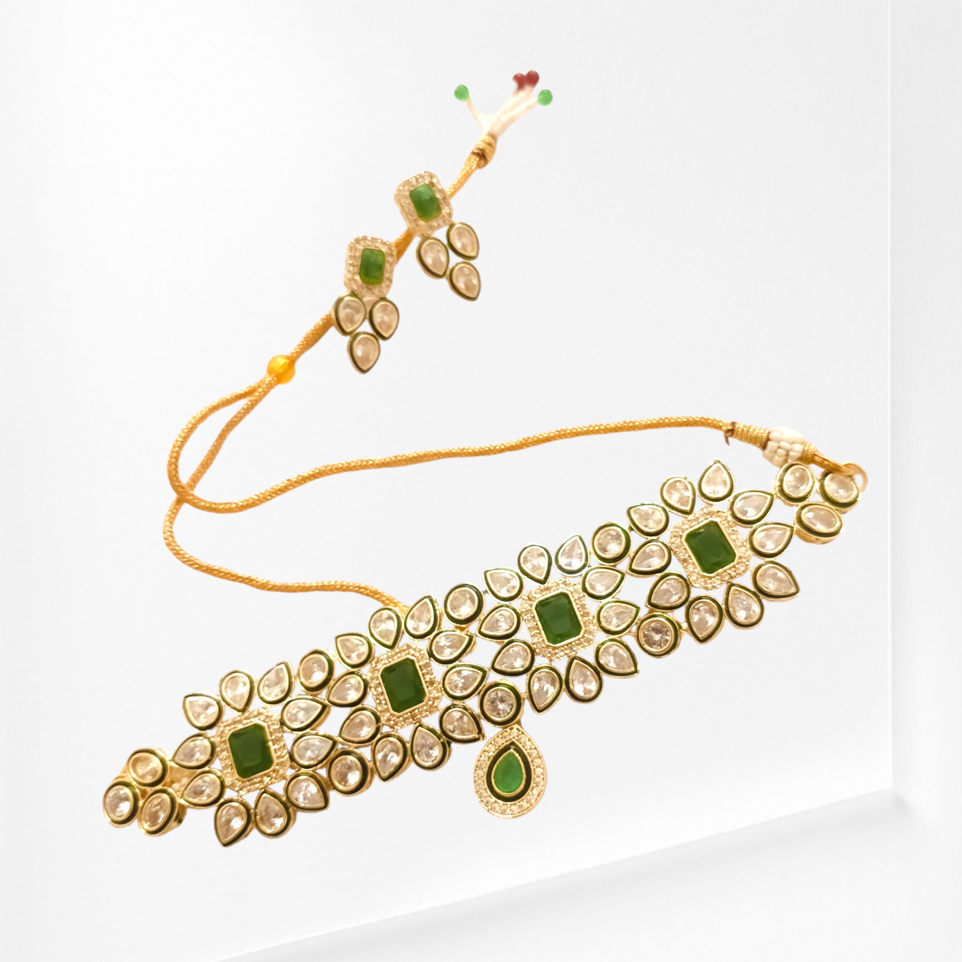 Style your outfit with the alluring floral Kundan necklace set. The stunning Kundan jewellery set takes you to a regal charm and nature’s elegance. Each petal in the Kundan choker set glisters with dew, capturing the magic with its shine. All the stones in this kundan bridal set are embellished with traditional work. You get to experience a celebration of timeless and renewal beauty. Once you wear this Kundan jewellery set, you drape a necklace full of tradition and luxury around your neck. The earrings in the kundan choker set are a perfect bold statement pieces in lightweight. Overall, this Kundan jewellery set is effortlessly glamorous and graceful.